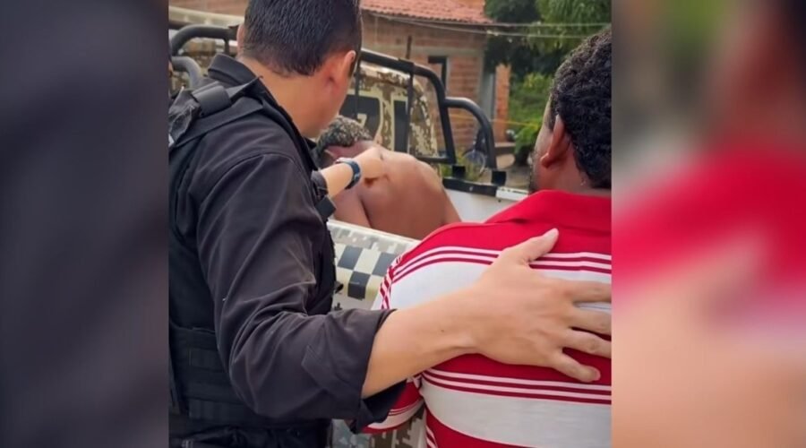 No vídeo, o jovem aparece algemado dentro de uma viatura, enquanto o pai chega ao local profundamente emocionado, questionando-o diante de outros familiares também consternados. Chorando, o homem desabafa: “Quantas vezes eu te falei, meu filho? Eu te ensinei. Já vendi o que eu não tinha, cara. Minha moto foi dada fim por você, meu filho.”